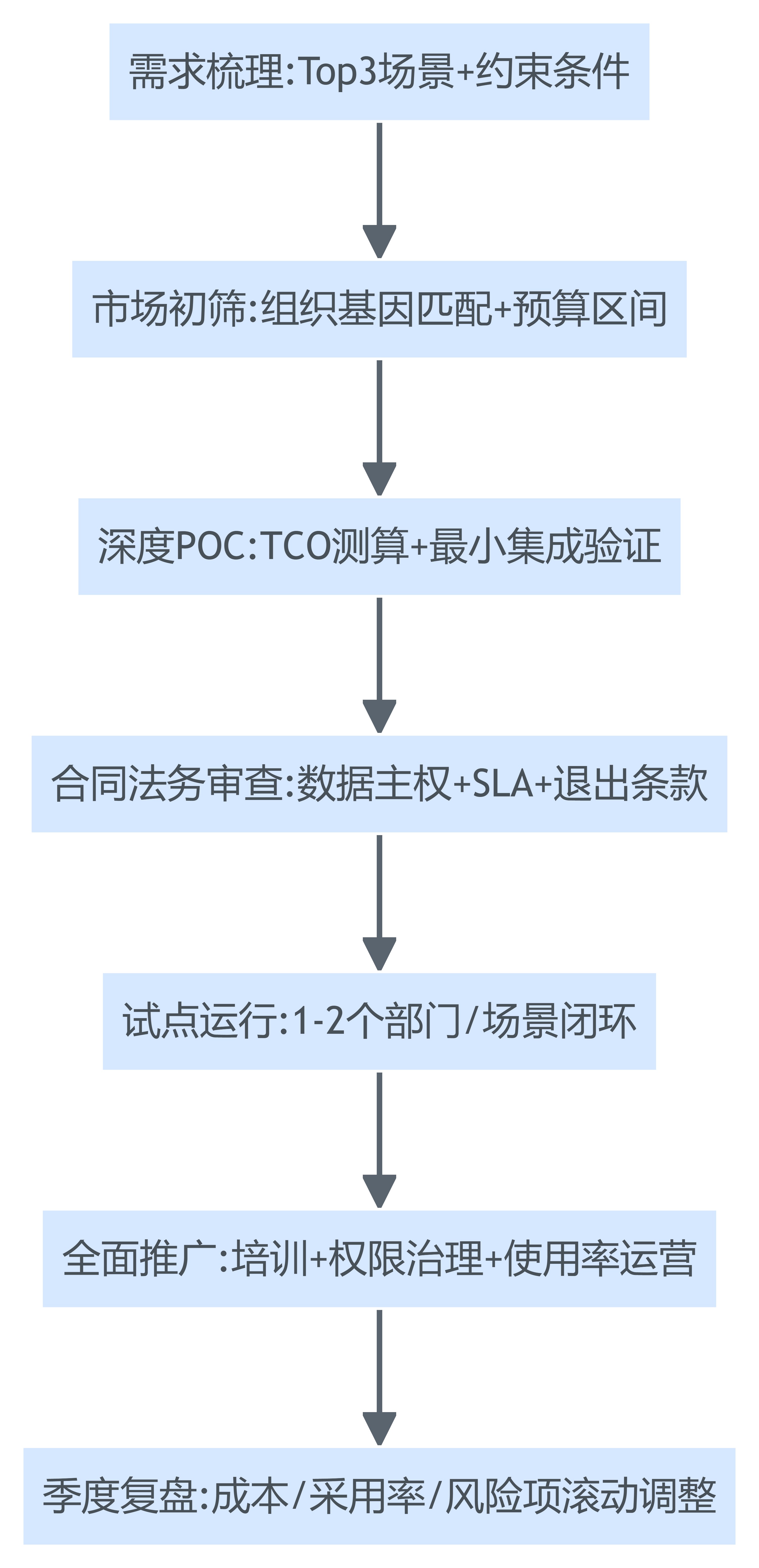 - 做可回滚:POC期间就规定数据导出方式与清退流程,避免试用期就被锁定。