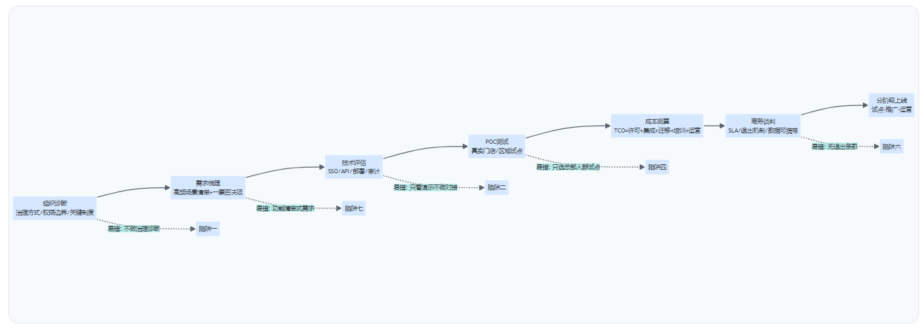 - 先诊断后选型:用1周时间梳理治理方式、权限边界与TOP20高频场景,形成一票否决项(SSO/API/审计/部署等)。