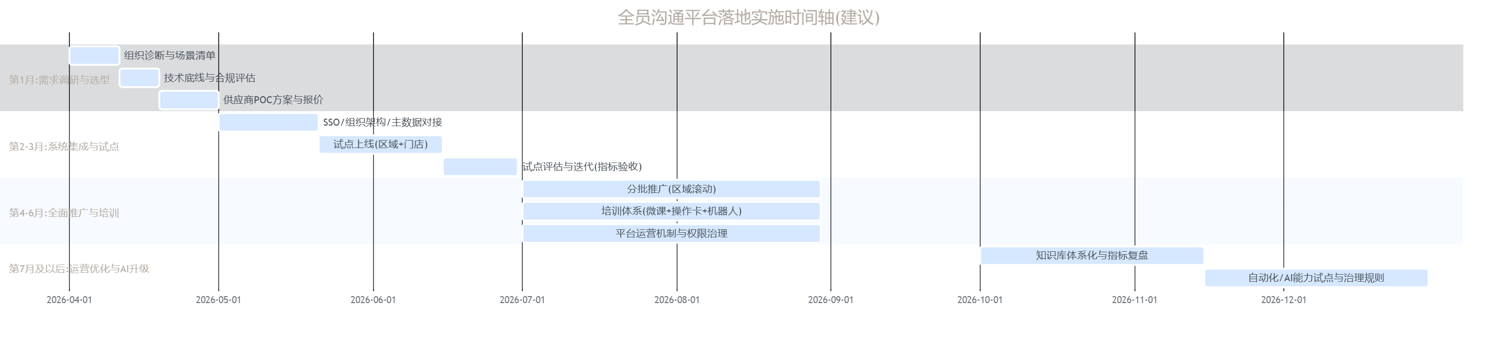 | 全员培训 | 一线操作、管理者报表 | 高 | 微课+操作卡+机器人,纳入验收指标 |