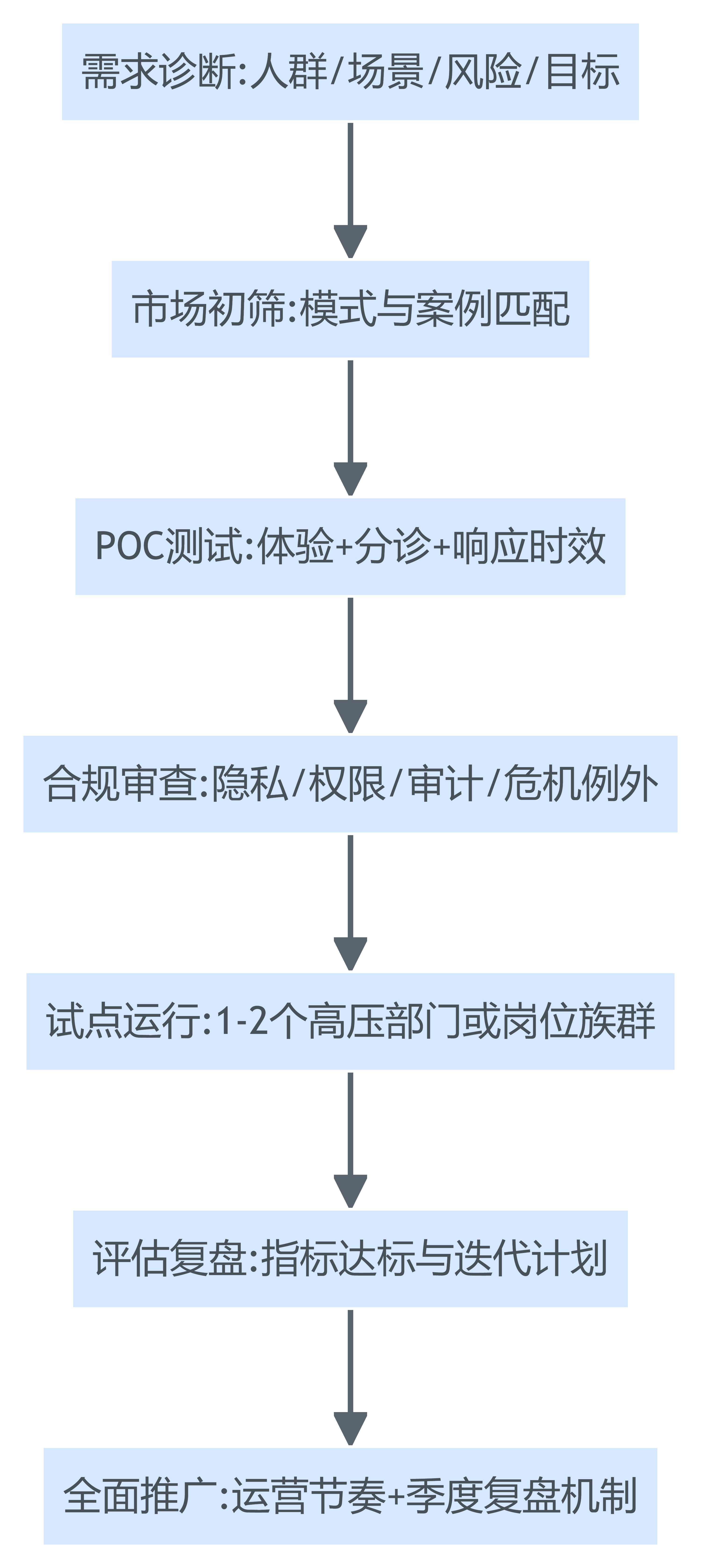 - 用POC验证体验与响应时效:让员工真实走一遍求助路径,验证匿名、分诊与预约速度,而不是只看演示。