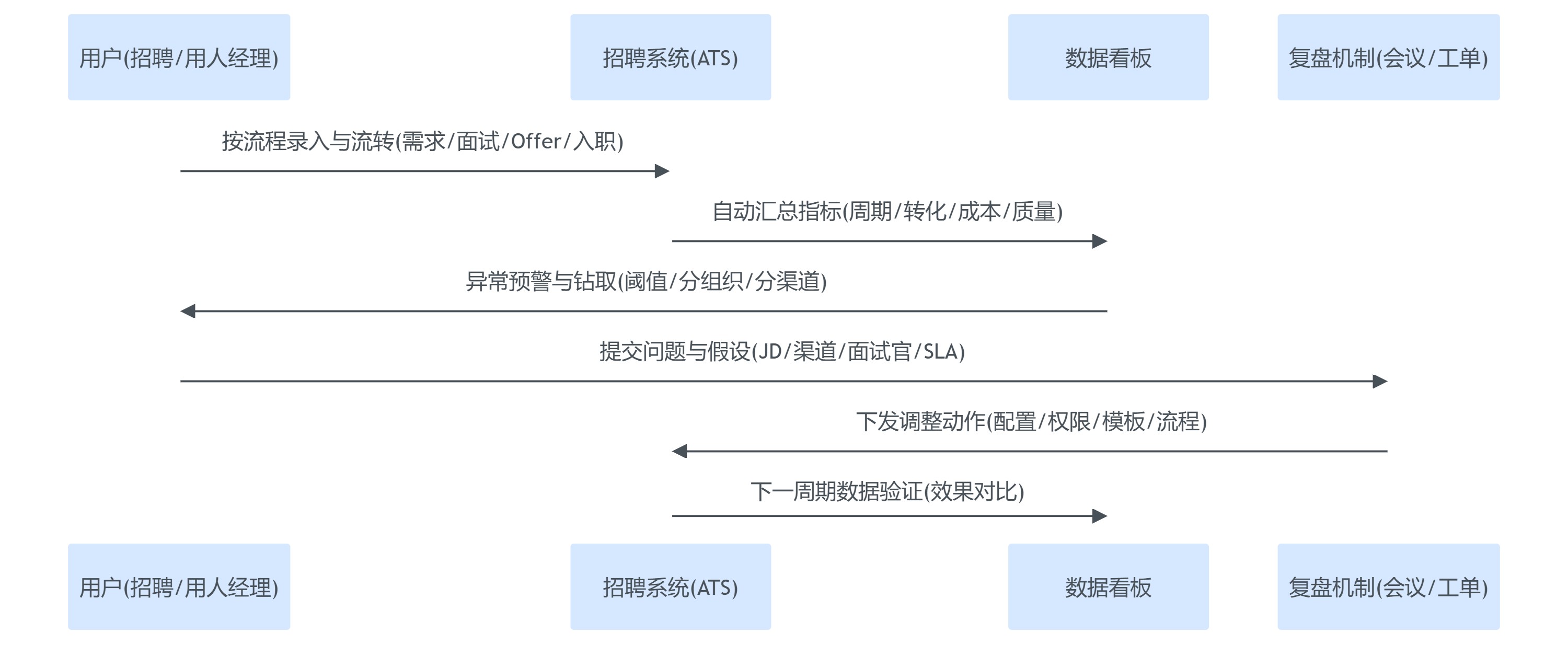 | 招聘流程与协同机制 | 状态机、面试安排、提醒、移动端反馈 | 提速与责任到人 | 面试反馈SLA达成率、流程跳转违规数 |