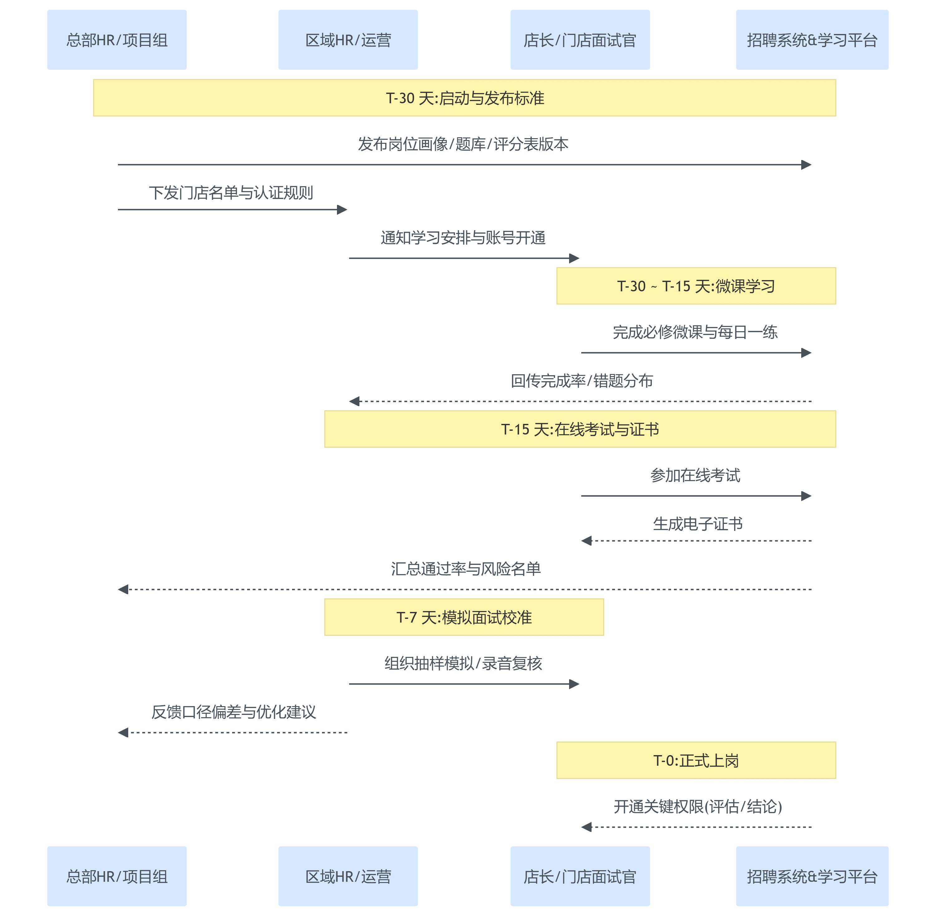 这一部分的核心提醒是:上线期不要指望“把所有人培训成专家”,而要把门店面试官训练成能按标准完成动作并留下可复盘数据的执行者,为后续校准迭代留下抓手。