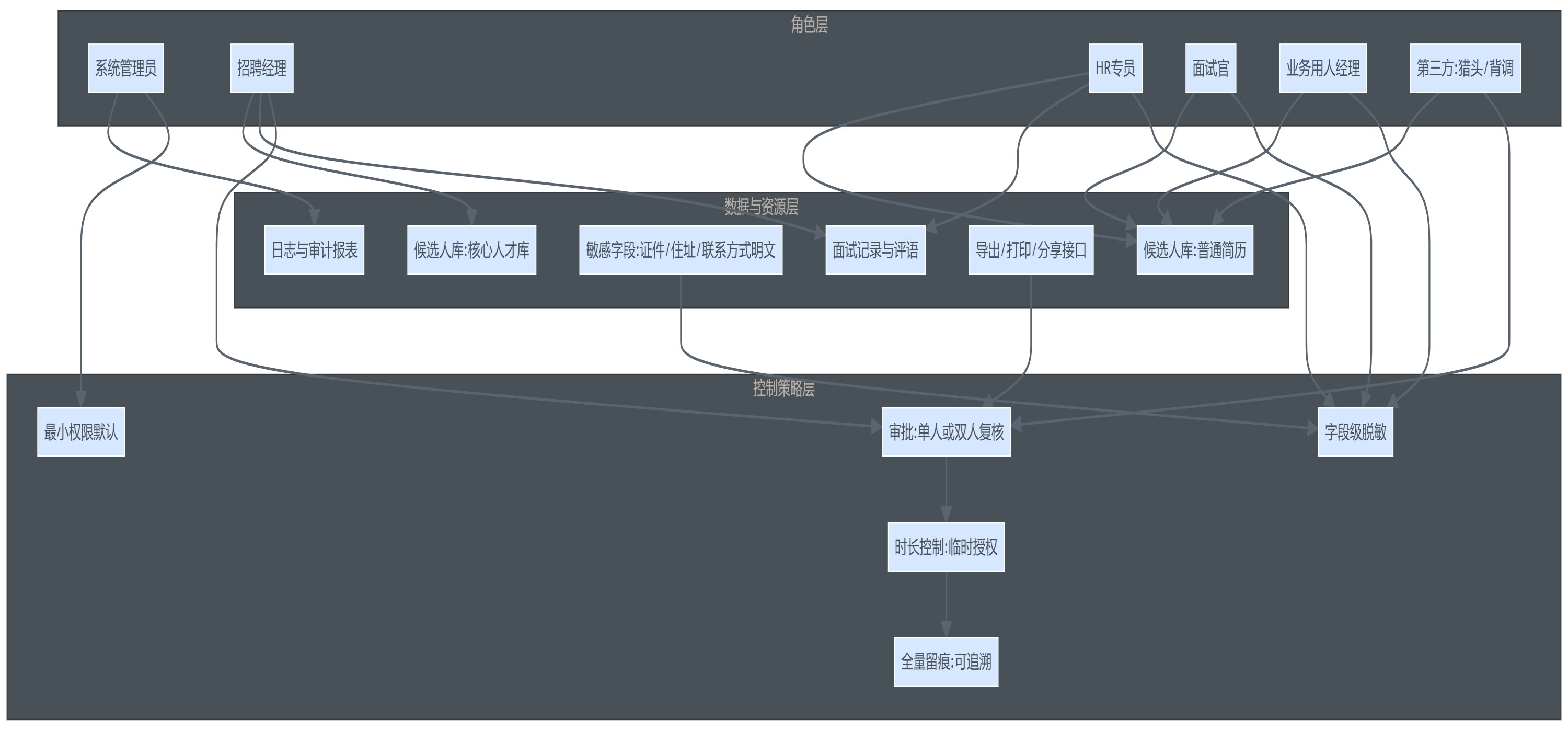 权限治理的难点在于:招聘链条涉及多个角色,且角色经常变化(项目组临时加入、业务侧换人、外包短期支持)。如果权限模型简单粗暴,就会出现两种极端: