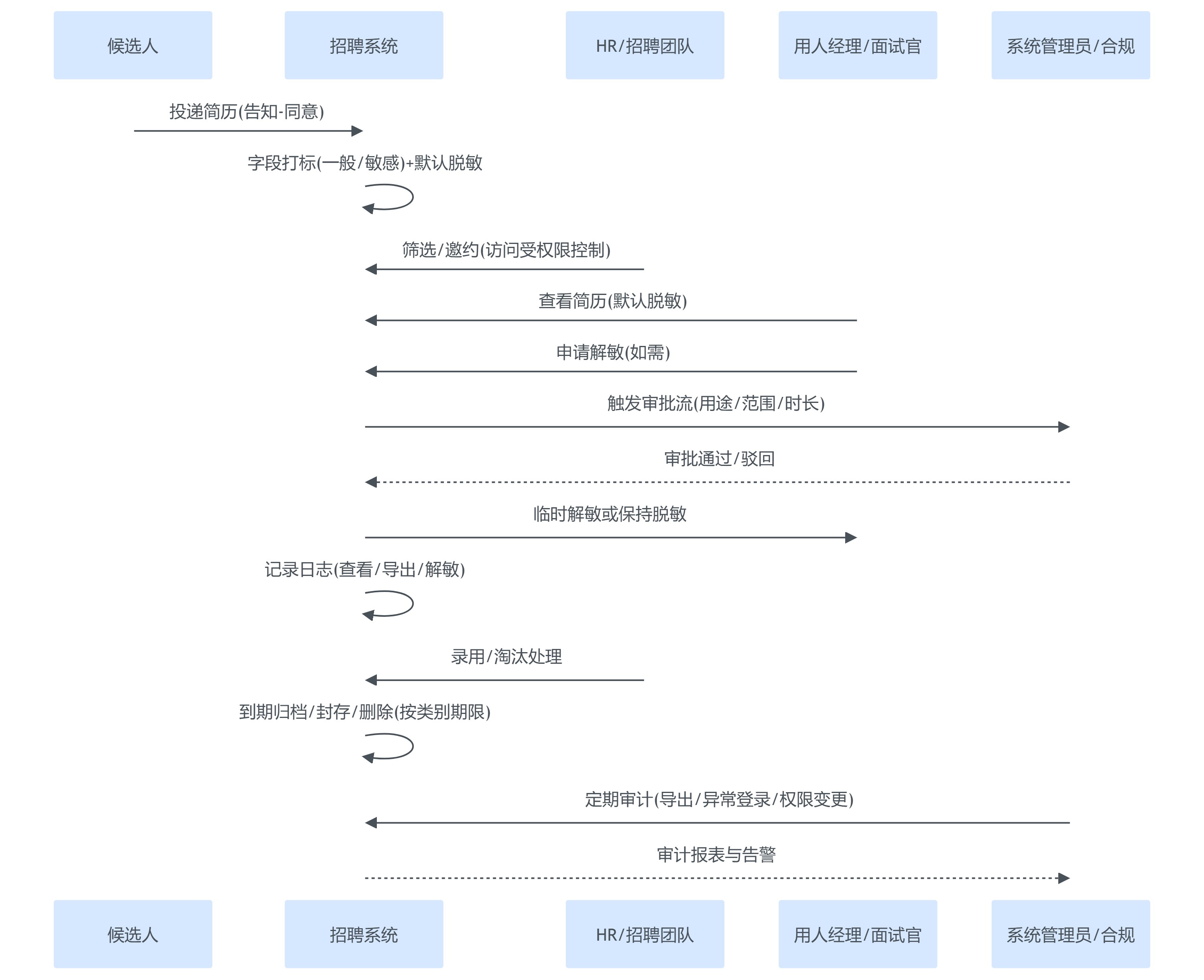 - HR专员/招聘顾问:重点在日常动作合规——如何发起解敏申请、如何正确共享给面试官、如何处理候选人删除请求、哪些渠道禁止传输简历。