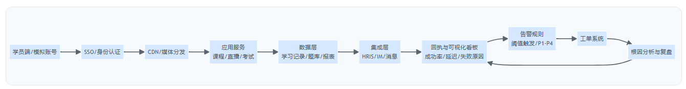 | 关注点 | 系统可用性、响应时间 | 端口在线但学习链路断 | 端到端学习旅程连续性(含登录/开课/提交/回写) |