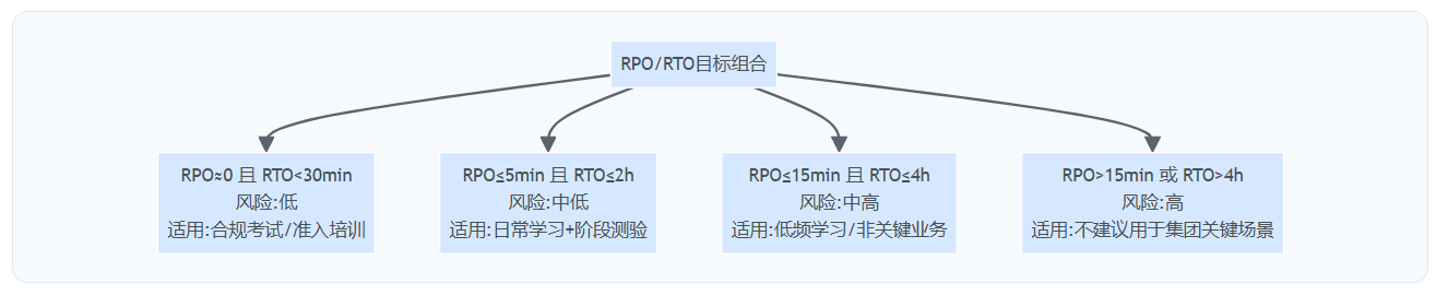 行业里较常见的基线是RPO≤5分钟、RTO≤30分钟;但在“全员在线考试”“强监管合规取证”的场景,RPO=0(或接近0)才更接近业务真实底线。曾有集团在考试交卷高峰发生异常,因RPO设置为15分钟,导致一批提交记录无法重建,后续只能人工补考并形成合规风险敞口——这种损失远大于把架构升级到更高可用所需的投入。