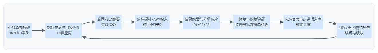 因此,建议用“共同签署”的方式固化治理:CHRO侧负责提出业务SLO(服务目标)与场景优先级,CIO侧负责把SLO翻译为SLA指标与监控方案,并共同对供应商进行季度评审。对集团型组织而言,这种协同机制的价值往往高于多写两条技术指标——因为它让“业务高峰不维护、重大事件必复盘、体验退化要预警”变成跨部门共识。