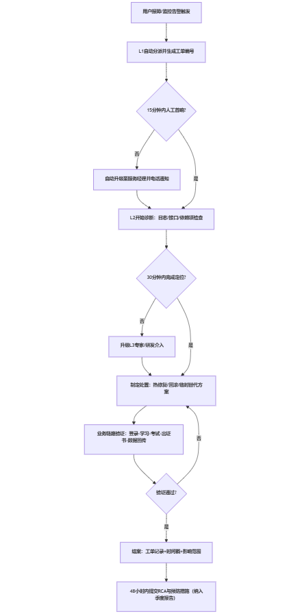 - 用业务影响定义故障等级:把登录、考试、证书、数据回传、SSO纳入P1判定条件,避免技术口径“达标但业务停摆”。