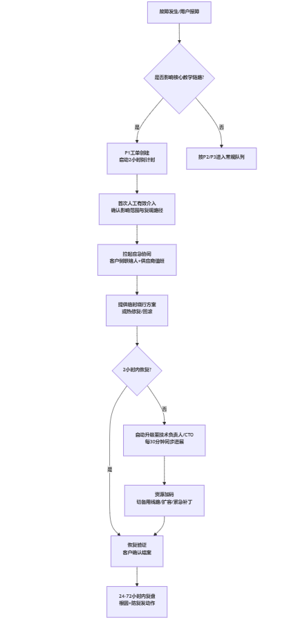 | P2 功能受限 | 部分核心功能受影响但可替代,或影响范围有限 | 课件上传失败;微信通知失效;报表延迟>24h | ≤ 1个工作日 | 超时升级至二线支持;提供临时替代路径 |