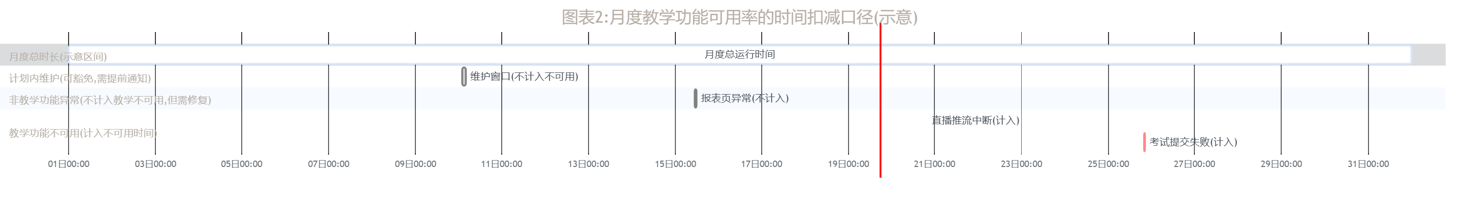 为了把“可用性计算口径”讲清楚,下面用一张甘特示意图展示月度时间扣减逻辑(示意用,便于沟通口径,实际计算仍以分钟汇总)。