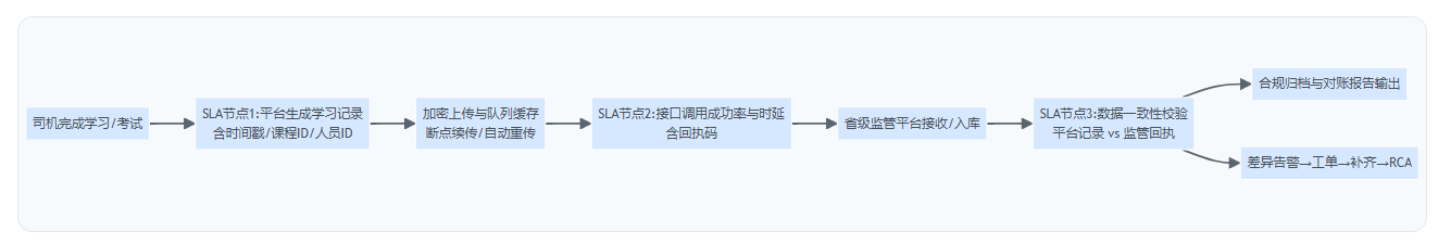 司机培训软件与监管平台之间,通常存在数据对接:学习记录、考试成绩、完课证明等要按接口规范上传到省级监管端或指定平台。此处SLA的核心不在“上传成功率99.9%”,而在于对企业来说,少上传一条记录就可能带来抽查不通过——合规场景下,“少量失败”并不等同于“可接受误差”。