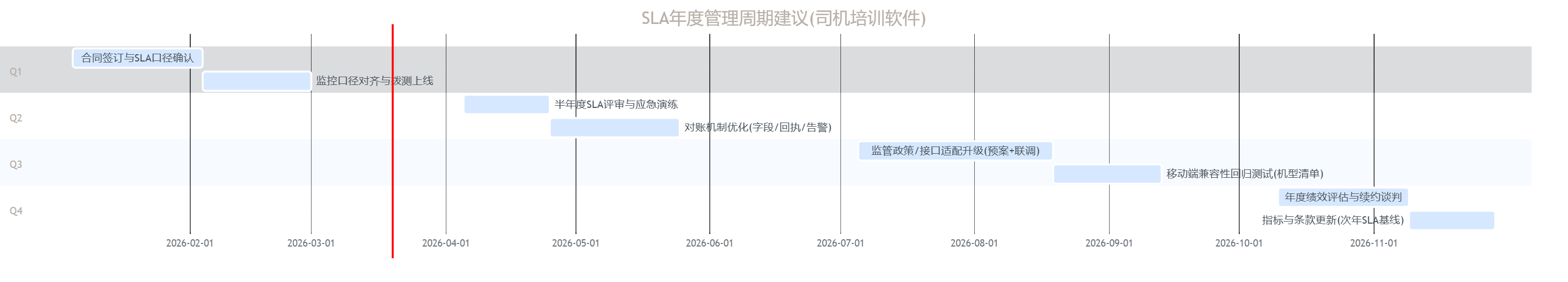 把SLA只写成“系统不宕机”,在司机继续教育场景往往不够;更关键的是确保培训行为发生后,合规数据能被监管端认可。这一模块建议企业先抓两条硬线:可用性与数据同步,再用对账机制把责任边界写清。