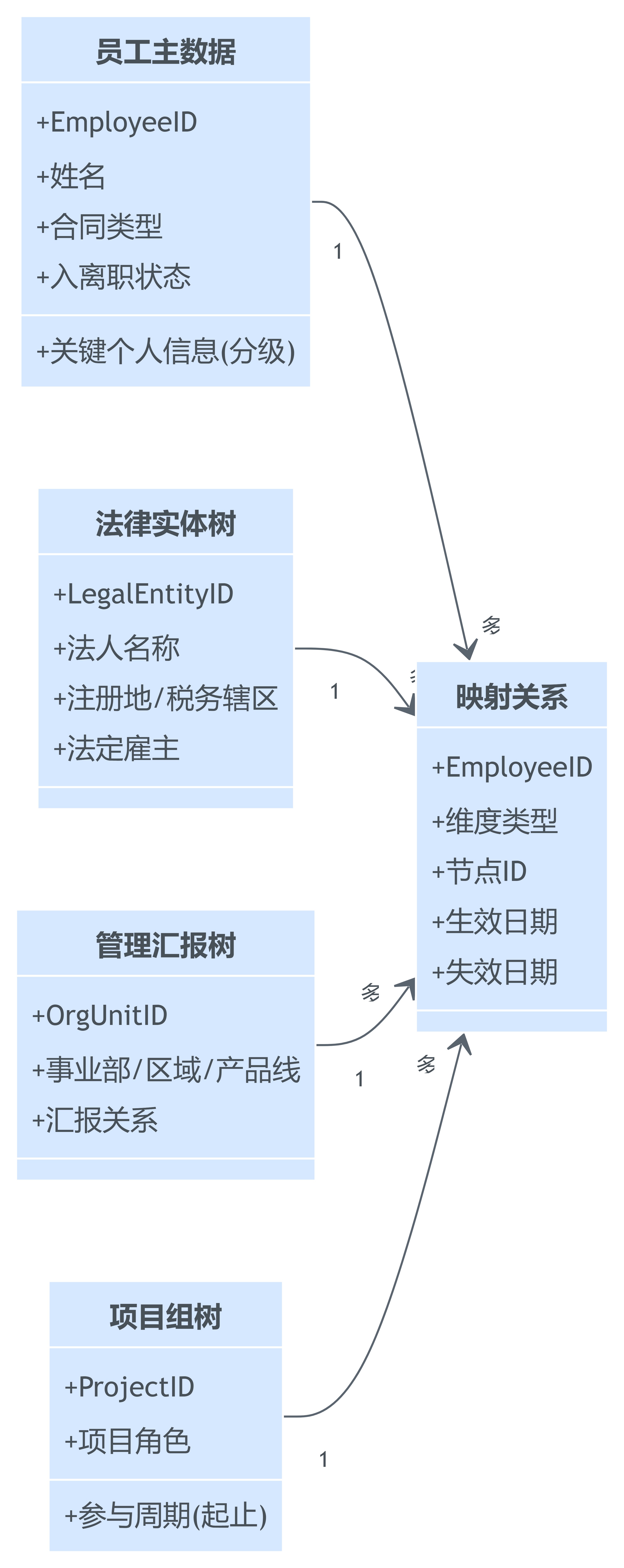 下面的结构图给出一种在OD系统中常见的建模方式:员工主数据作为“单一事实源”,不同组织维度各自维护节点与关系,通过映射表关联员工归属与岗位关系。