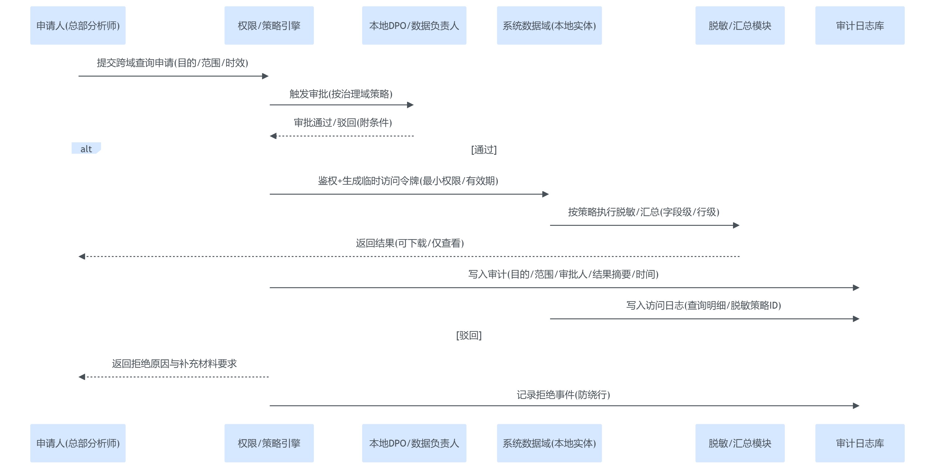 下面的时序图展示一次跨国数据查询请求的闭环过程,重点在“预授权—目的记录—脱敏—审计固化”。