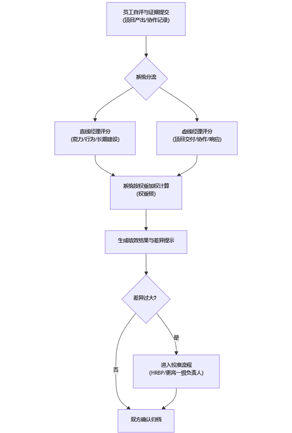| 绩效分配 | 虚线评价入口、权重锁、差异校准流程 | 虚线经理可评但不可改薪;评分口径与维度可追溯 | 加权结果、差异报告、校准记录 |