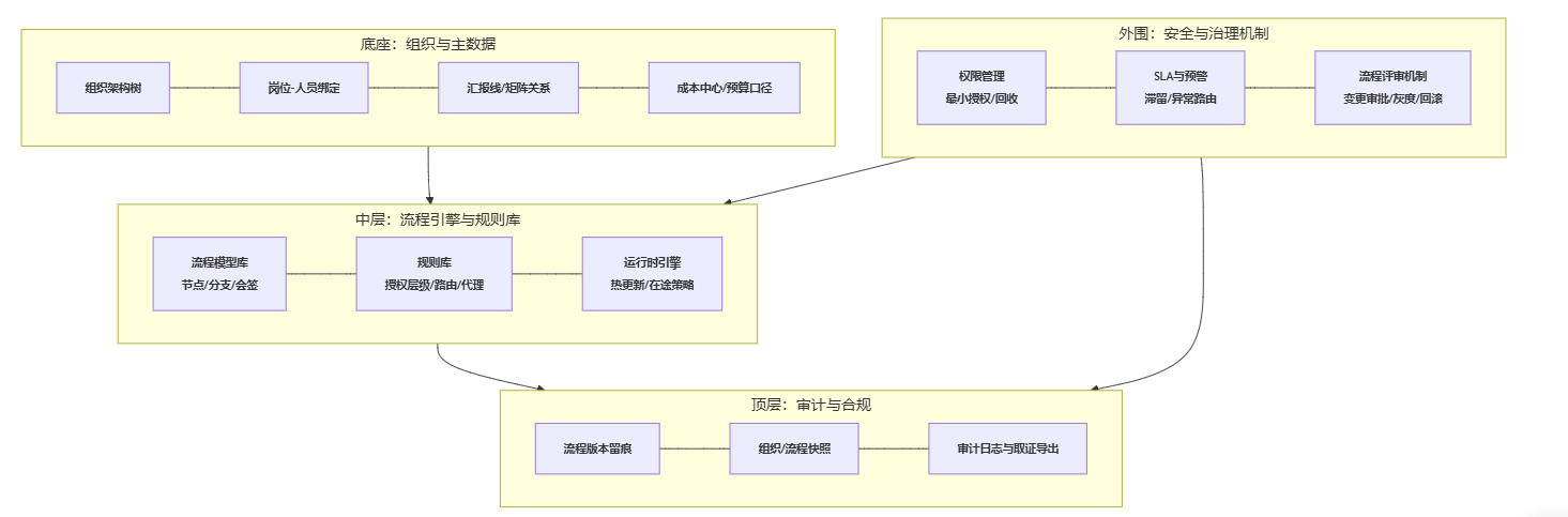 | 审批人定义 | 写死到人/固定部门 | 基于岗位/角色/组织关系动态计算 |