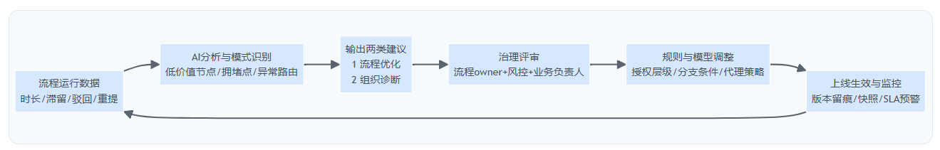 走到2026年,流程引擎的角色会从“执行与路由”进一步延伸到“诊断与建议”。但AI增强不是让系统替人拍板,而是用数据把组织与流程的低效之处暴露出来,并给出可验证的优化选项。