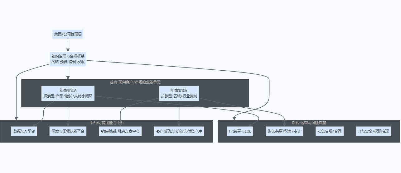 - 前台-中台-后台并不是“组织更复杂”,而是把可复用能力(如研发平台、数据能力、销售赋能、合规与财务共享)沉到中台/后台,让前台更轻、更敏捷;新事业部组建时,更多是“挂接能力”而非“从零搭全套”。