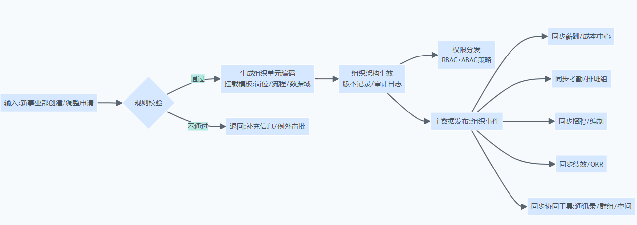 - 事件驱动联动:当新事业部创建/调整/合并/拆分时,系统发布组织事件,自动触发下游系统的同步与校验,而不是靠人发通知。