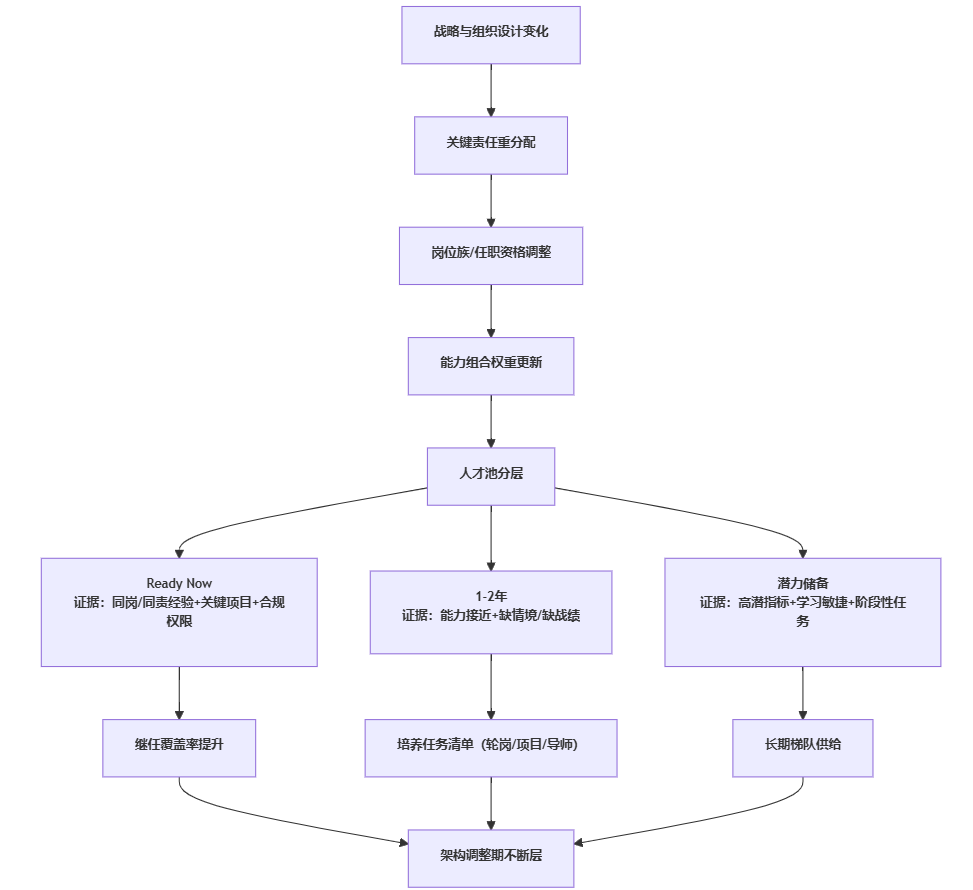 | 触发时机 | 年度盘点/领导离任前 | 架构变更、岗位族调整、关键责任迁移即时触发 |