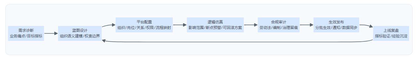 - 流程编排:把组织变更当作一个可审批、可模拟、可发布的流程实例,支持灰度生效、分批通知、回滚策略。