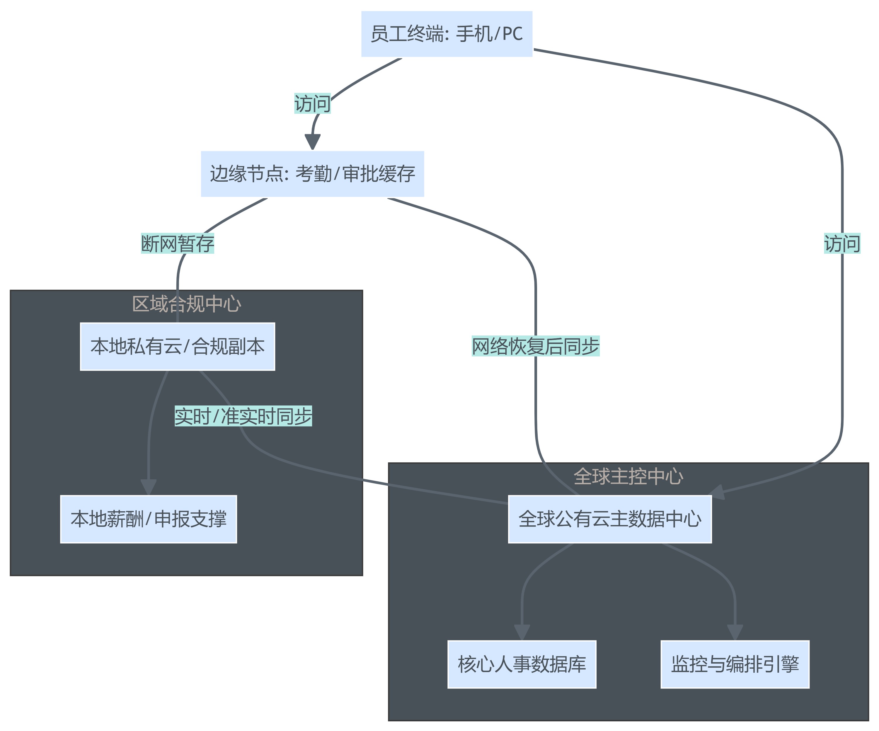 要在跨国网络中断下维持HR关键流程,技术架构需要从“中心化恢复”转向“分布式保底”:先保证区域可运行,再保证全局可对账,最后恢复一致。