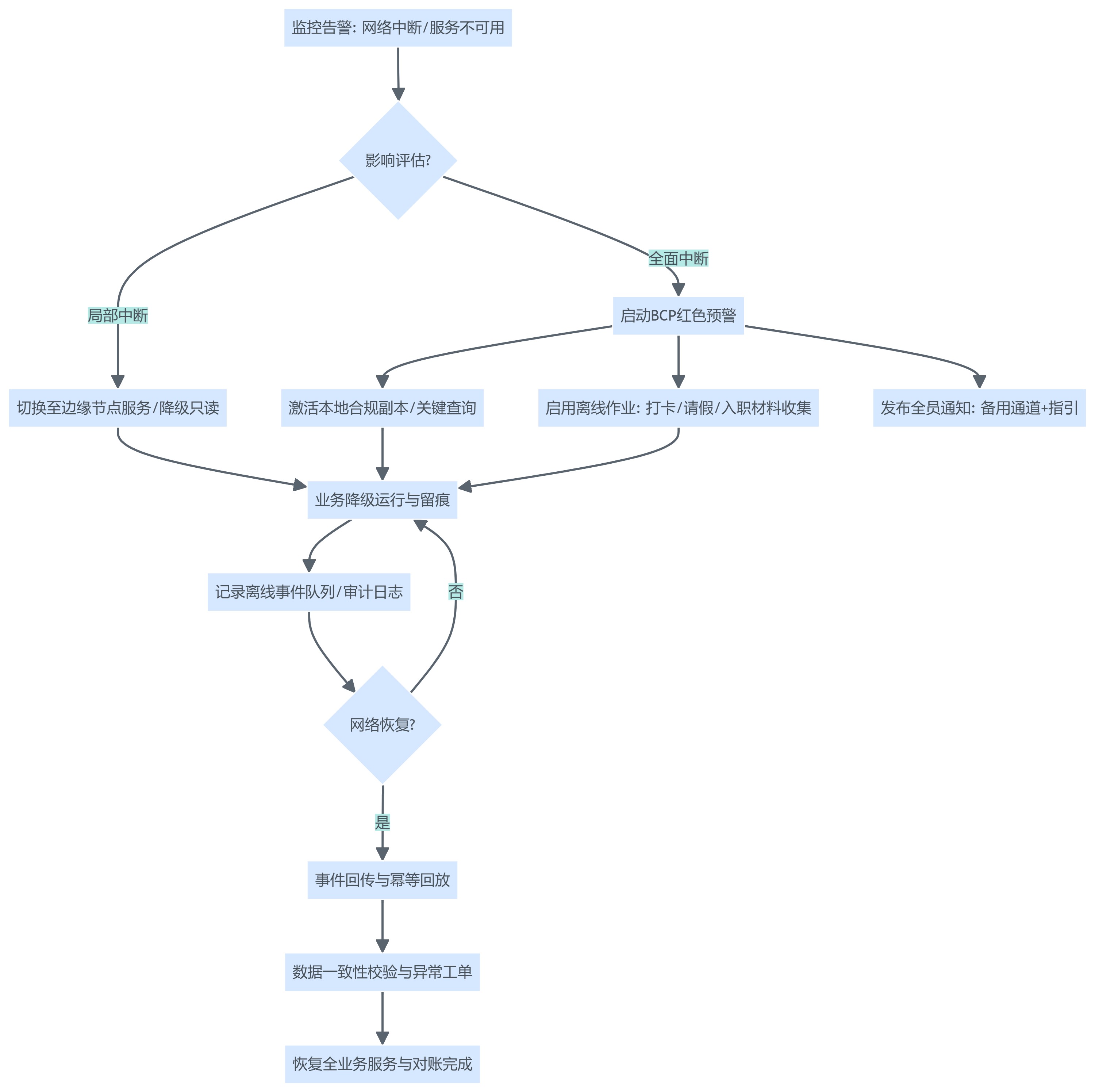- 替代路径:断网期间员工如何打卡、如何请假、如何提交紧急证明、如何联系HRBP。