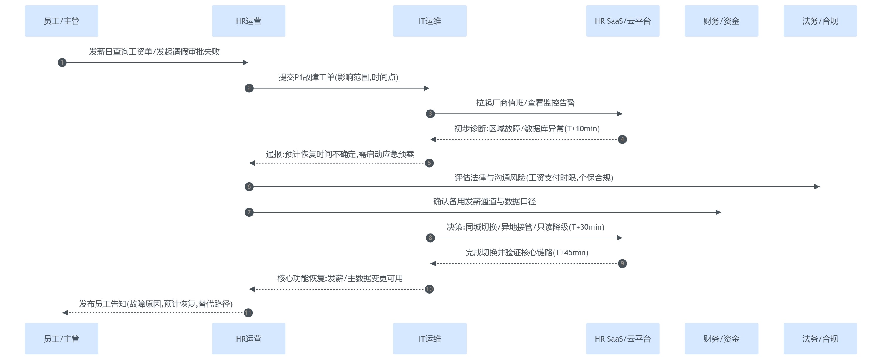 - 故障发生后30分钟内,HR必须能完成:发起发薪审批、导出个税申报数据、冻结敏感信息变更入口并留痕