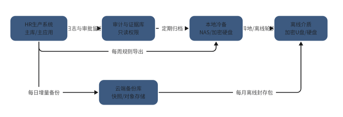 | 加密U盘/硬盘(离线封存) | 异地/离线备份 | 保险柜双人保管 | HR+财务 | 每月封存 |