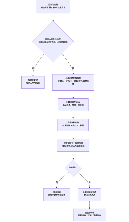 - 决策链:达到何种影响等级时,由HRD/CHRO/财务负责人/CIO分别拍板什么事项(例如:发薪策略、对外沟通、是否报备监管)。