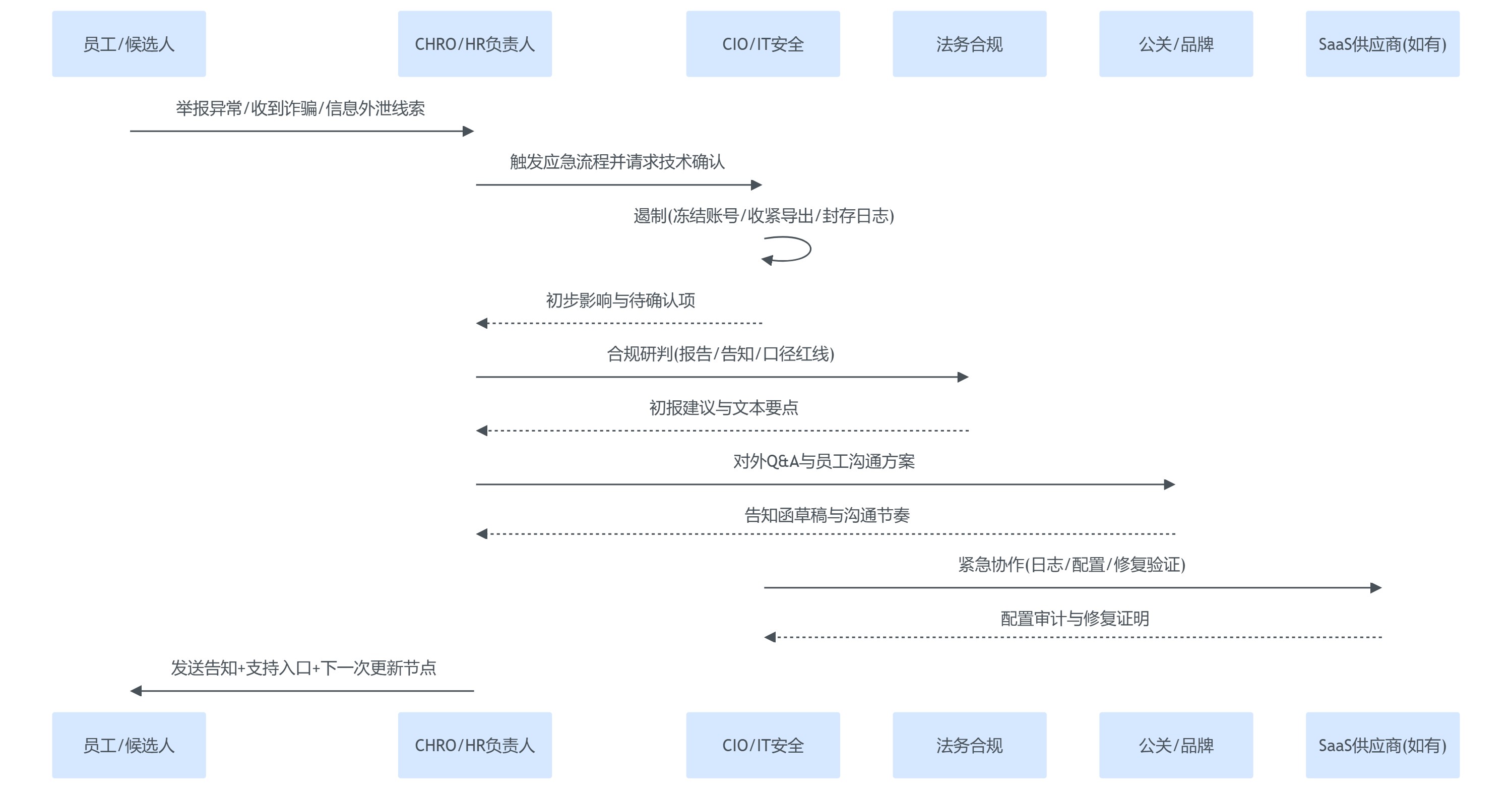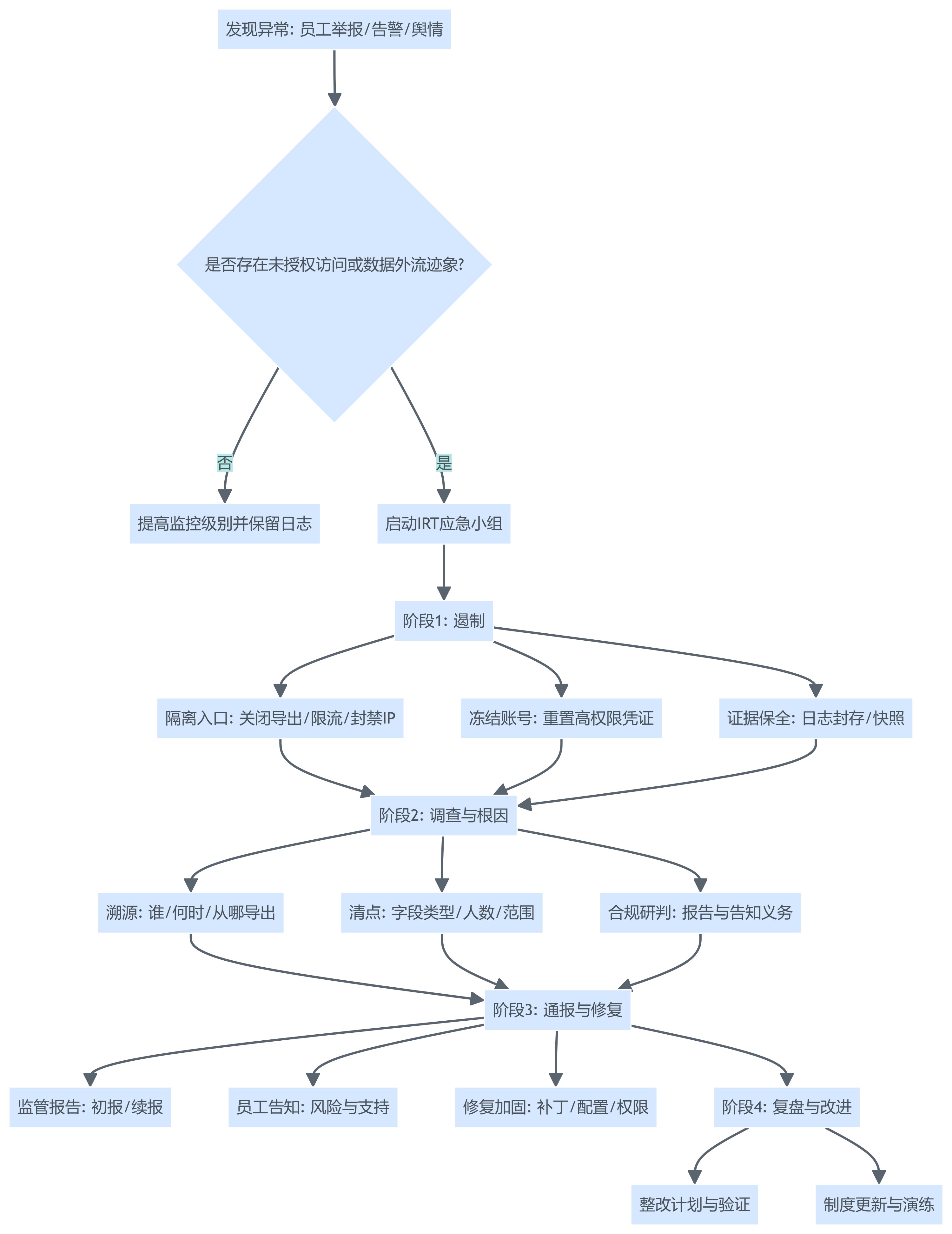 | T+0小时 | 启动IRT、冻结可疑账号、导出能力收紧 | CIO/CHRO | 启动指令、变更记录 |
