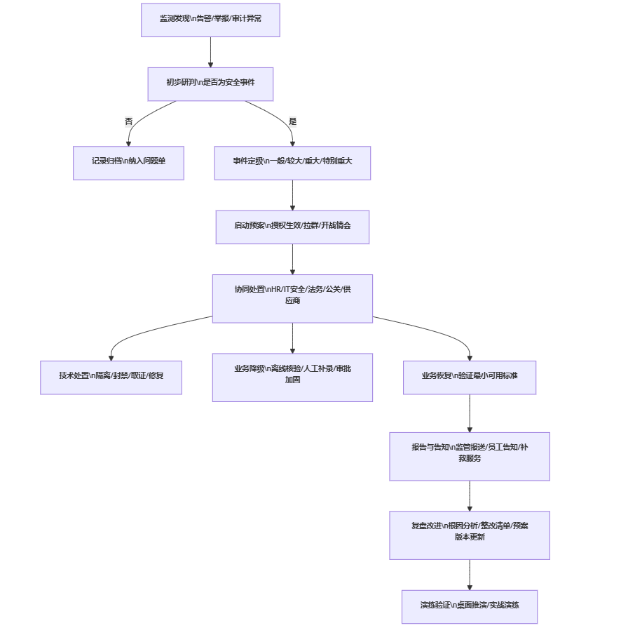 - 通知:同时通知安全值班、HR系统管理员、薪酬负责人;若达到“重大”阈值自动升级到指挥层;