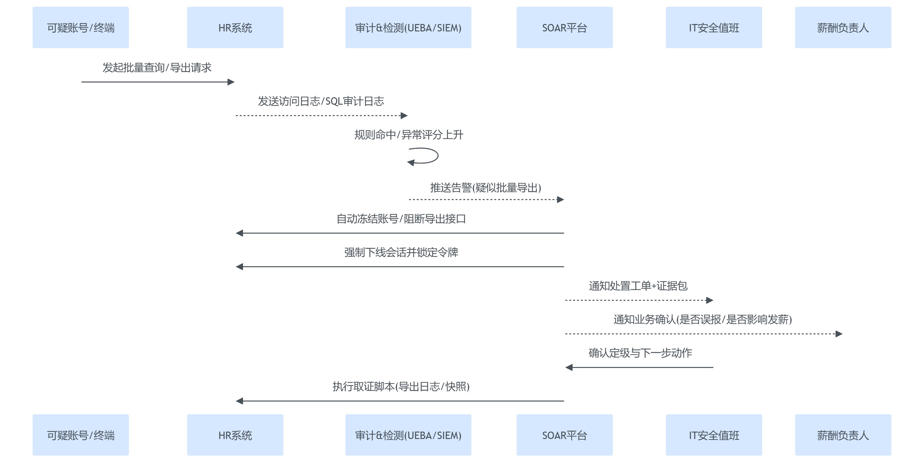 图表2:SOAR自动化响应示例——检测到异常批量导出薪酬数据后的时序交互
