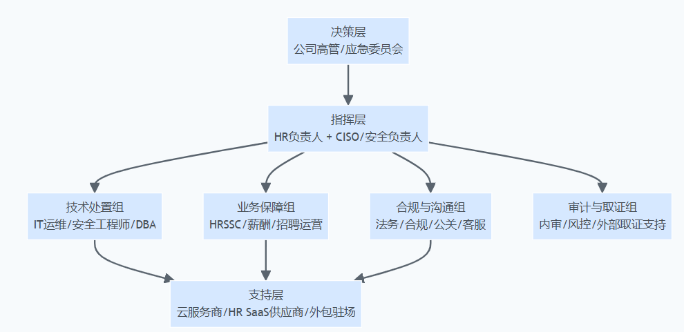 应急预案最终能否跑通,决定因素往往不在技术,而在组织:谁有权做决策、谁承担责任、谁能协调资源、谁来面对员工与监管。HR系统应急处置尤其需要跨部门协作,因为很多动作牵涉业务停摆、薪酬发放、对外告知与法律风险。