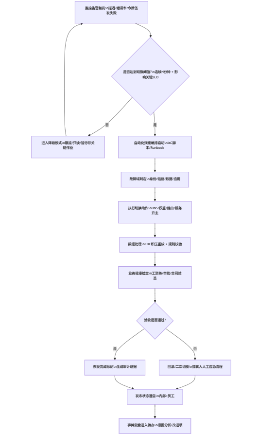 | 切换方式 | 人工决策 + 手工切DNS/启服务 | 自动化编排(监测→判定→切换→校验) |