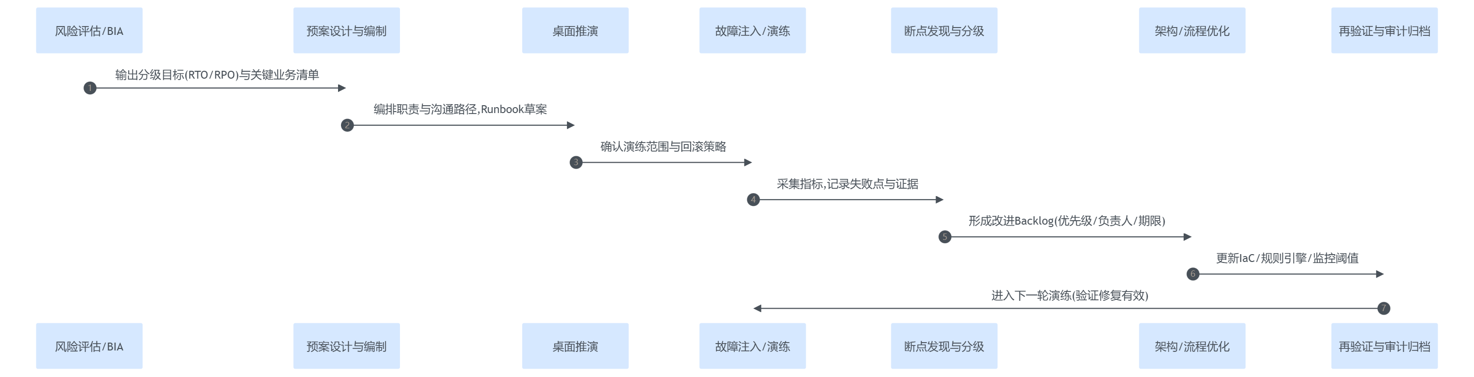| 验证方式 | 桌面推演、年检式演练 | 常态演练 + 灰度故障注入 + 可验收指标 |
