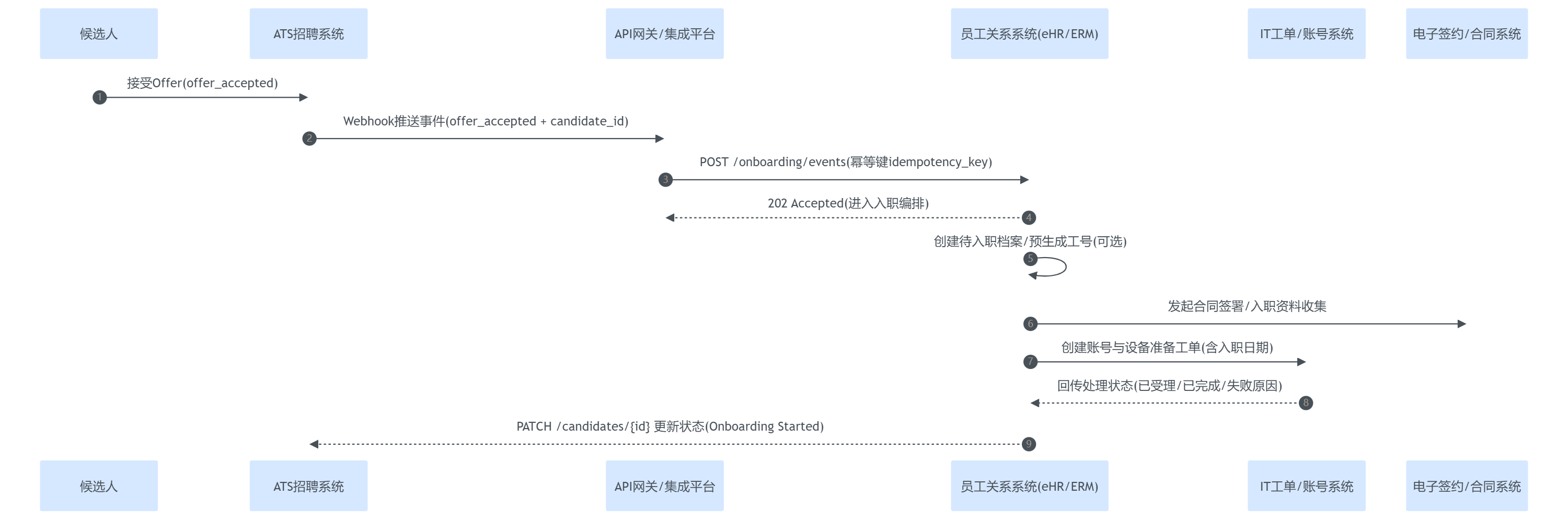 下面用一张时序图,把“候选人点击接受Offer”到“员工关系系统启动入职”的关键交互讲清楚。