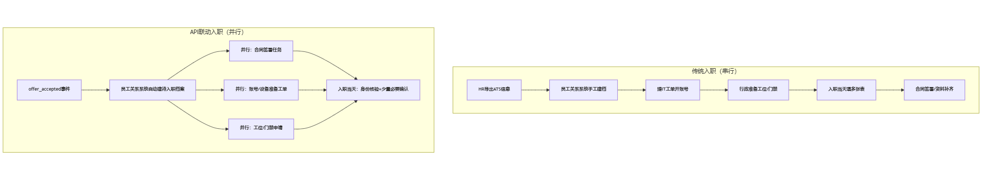 边界条件同样存在:如果企业的门禁、资产、合同系统完全离线或不开放接口,并行化会受限。此时仍可先用员工关系系统生成统一的入职任务看板,哪怕后端动作仍由人执行,至少前端对新员工呈现的是一个一致的进度面板,而不是多个部门各发一条消息。