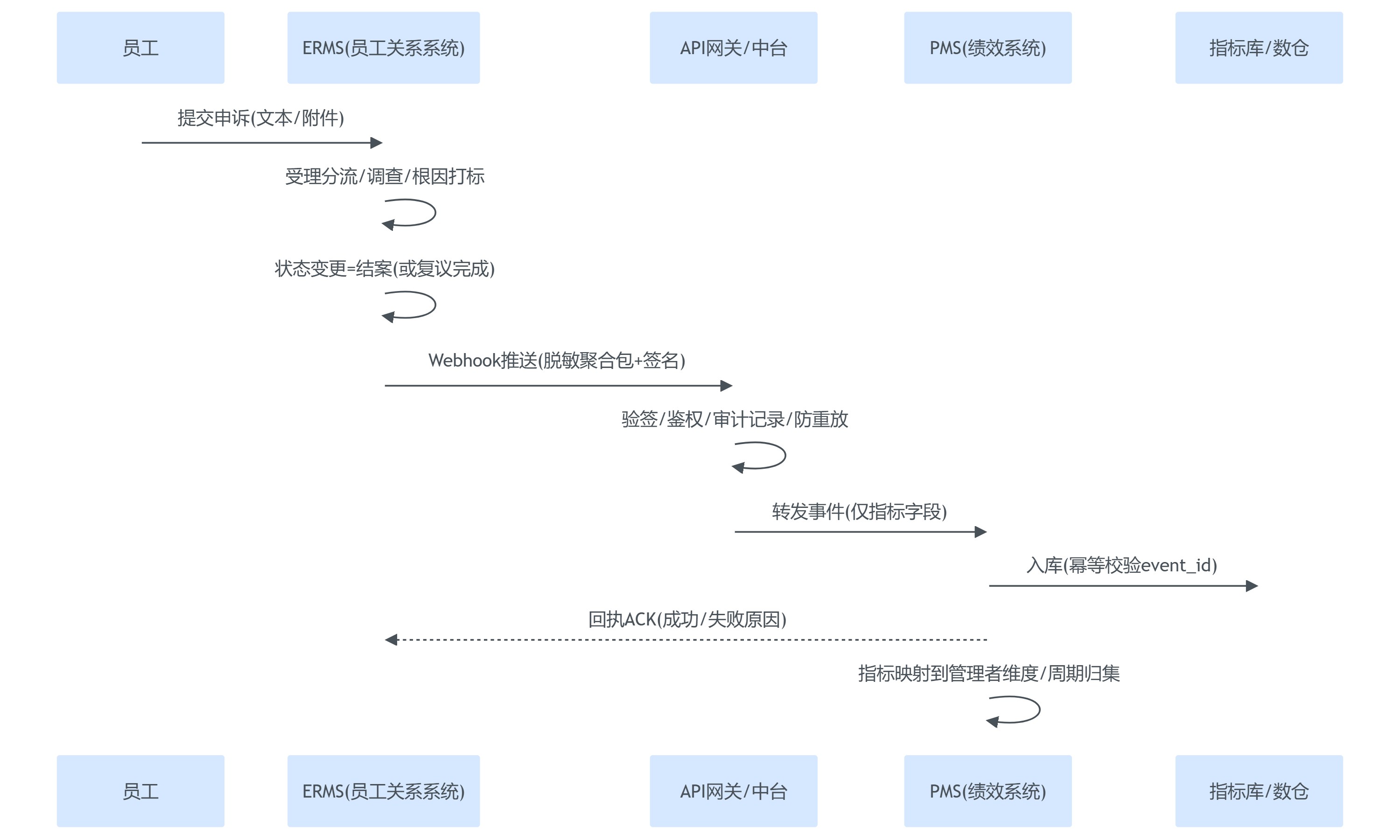 技术上真正难的从来不是“连通接口”,而是让数据在合规边界内变得可用、可解释、可追溯。本文主张采用事件驱动 + 脱敏聚合的对接方式:ER系统负责收集与处置个案,绩效系统只接收部门/团队/管理者维度的治理指标,不接收个人敏感细节,从源头降低合规与信任风险。