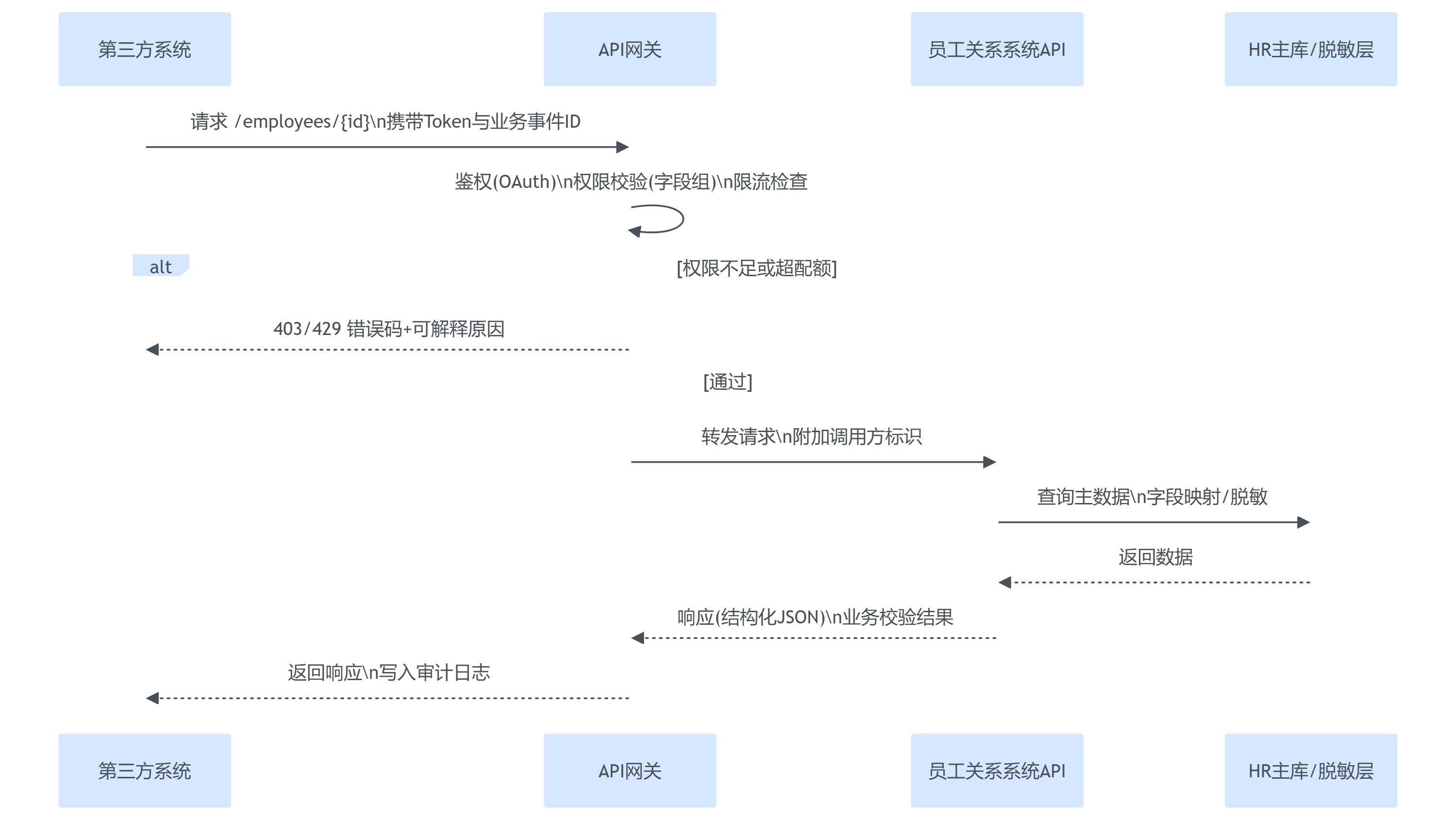 - 为什么调用:调用必须绑定业务事件(入职、异动、离职、组织调整、试用转正等),避免“批量拉数”变成灰色数据集市。