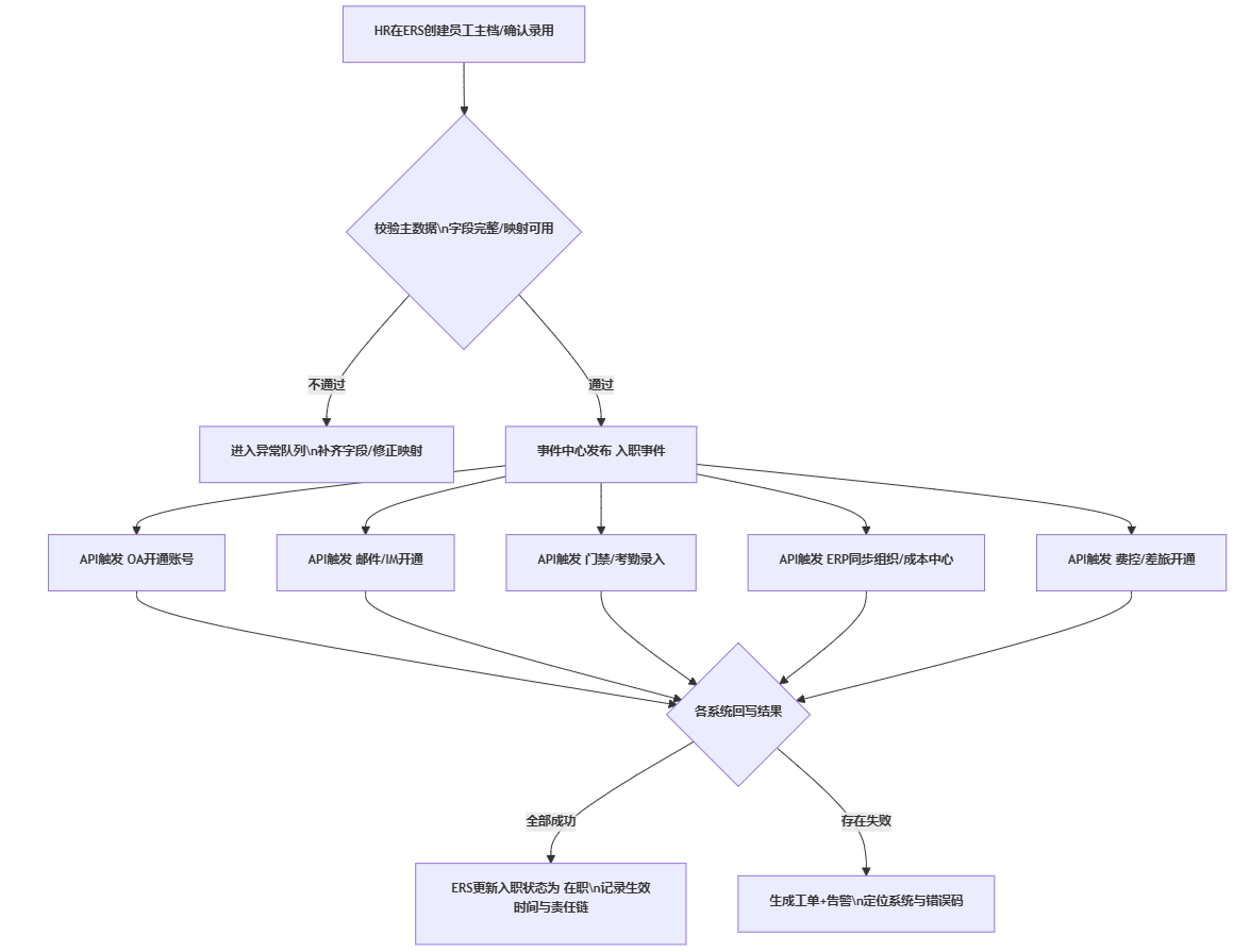 - 回写逻辑:当某系统开通失败,返回错误码与原因,ERS生成异常工单给对应系统管理员;所有开通完成后,ERS将入职状态从待入职更新为在职,并写入生效时间。