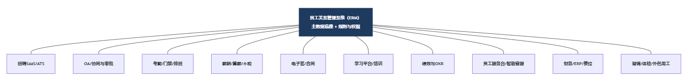 为了便于理解生态形态,我们用结构图把“以ERM为底座的HR生态”画出来(使用稳定的flowchart表达中心辐射结构)。