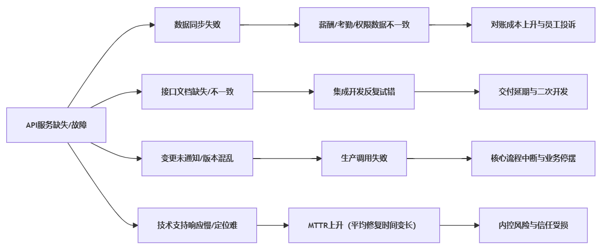 - 接口变更未通知:调用方在生产环境突然报错,HR流程中断,触发员工投诉或内部流程超时。