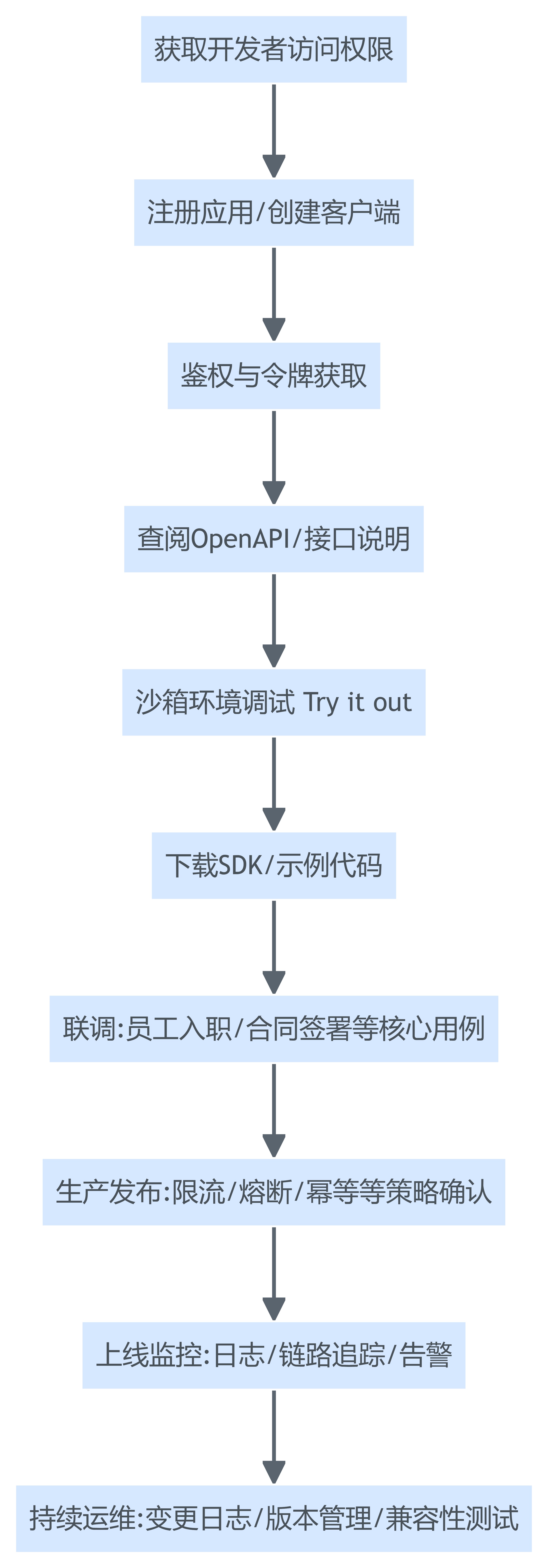 1)创建应用与鉴权;2)调用“员工入职”接口写入;3)触发事件推送或查询回读;4)故意制造一次错误并按文档修复;5)展示Changelog与版本策略。