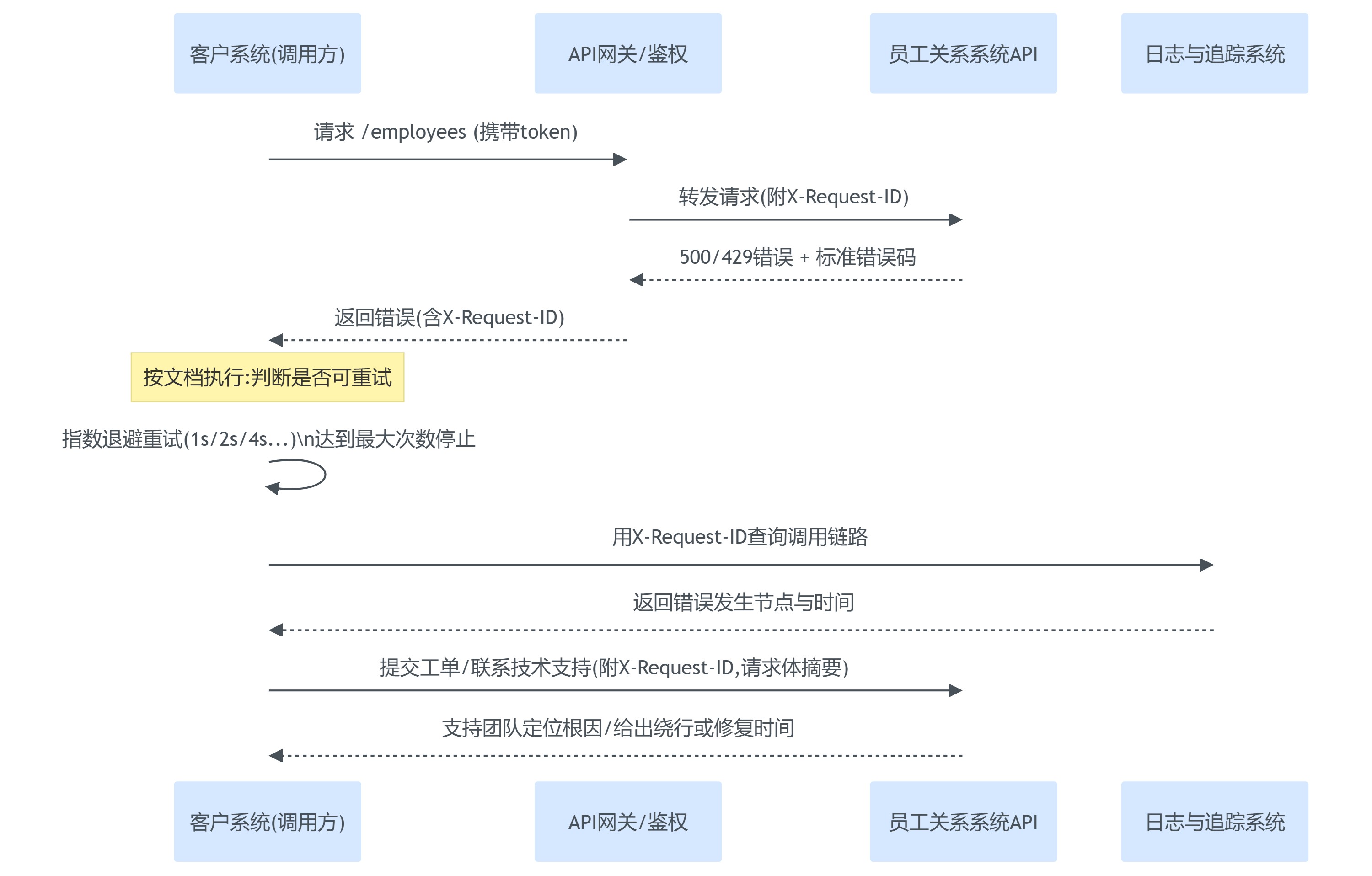 | 错误处理 | 错误码不全、处理建议模糊 | 错误码体系完整,给出重试/补偿/联系支持的判据 |