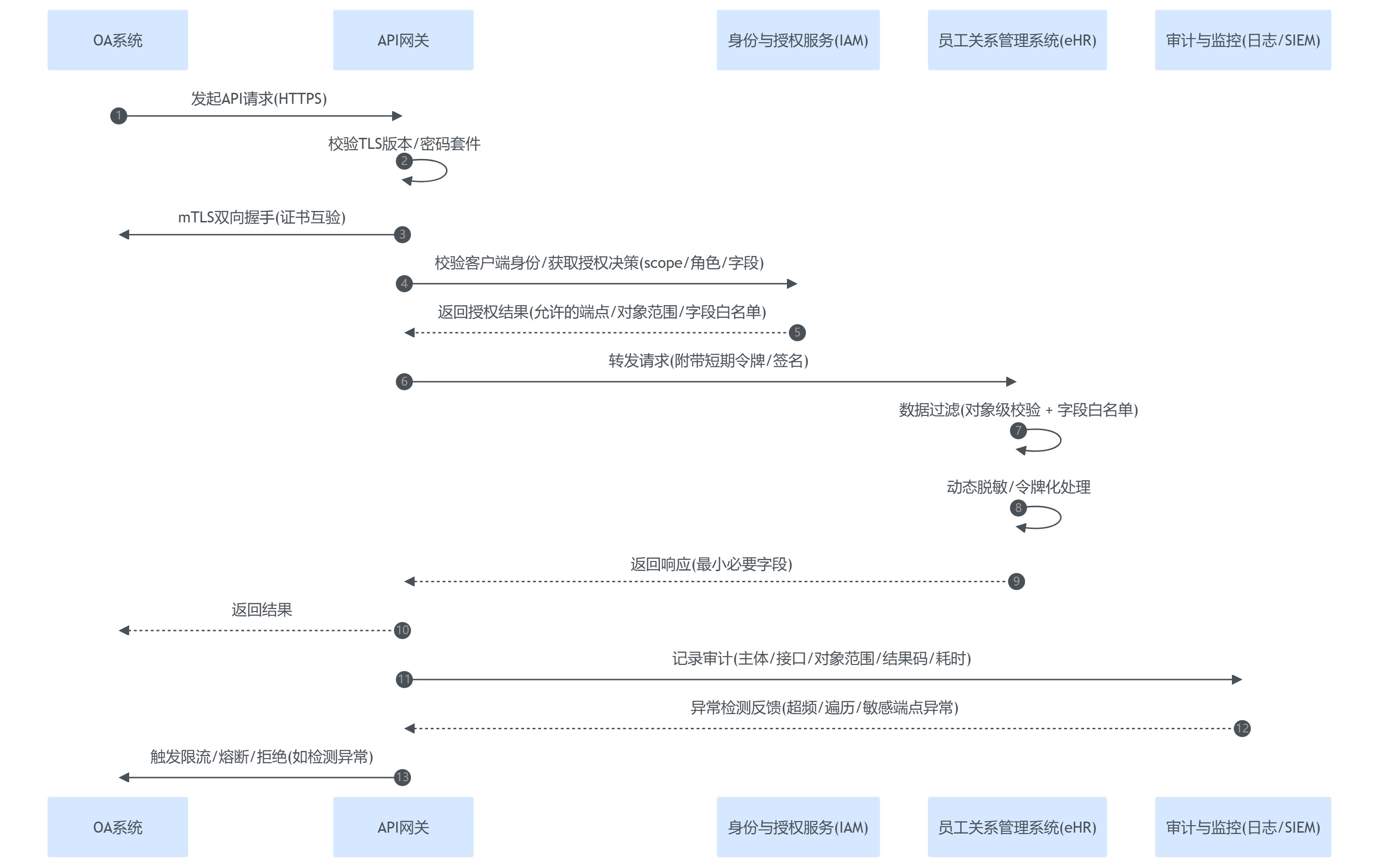 图表1:eHR与OA系统安全API交互时序图(含网关、mTLS、脱敏与审计)