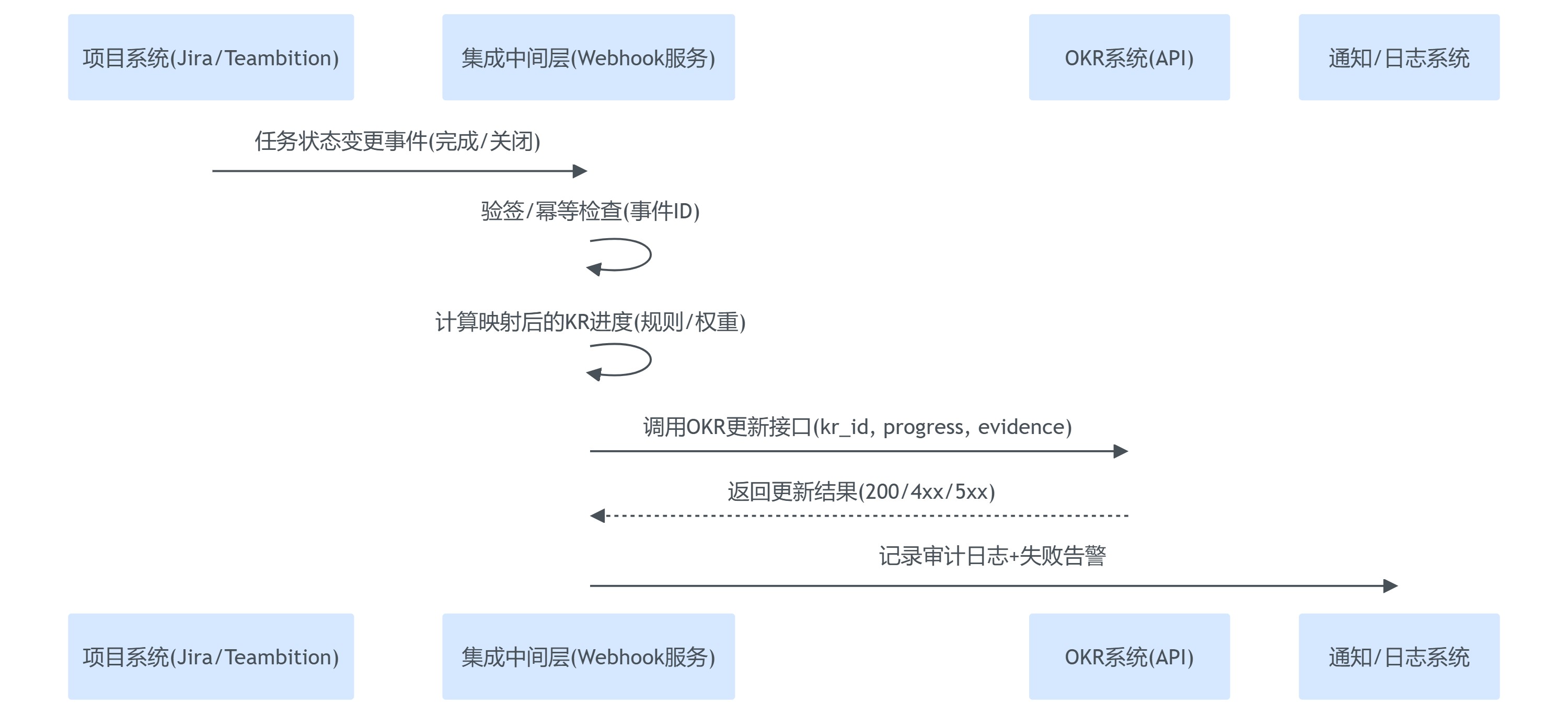 | 项目↔OKR对齐 | 任务完成/里程碑达成 | OKR API/中间层 | 减少手填、提高真实性 |