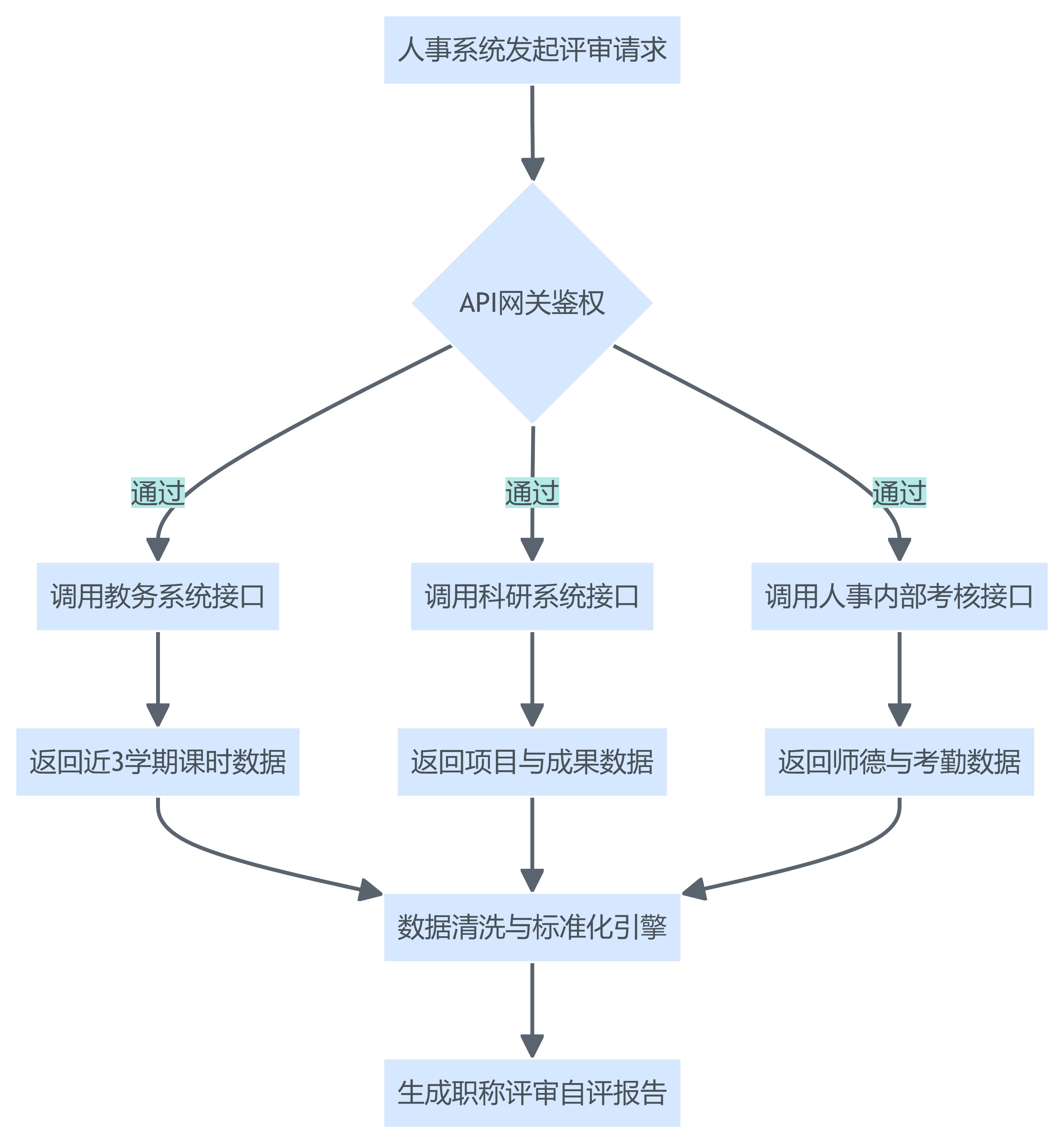 - 主请求发起方:通常在人事系统或评审系统内发起,带上教师ID、评审类型、统计周期、口径版本号。