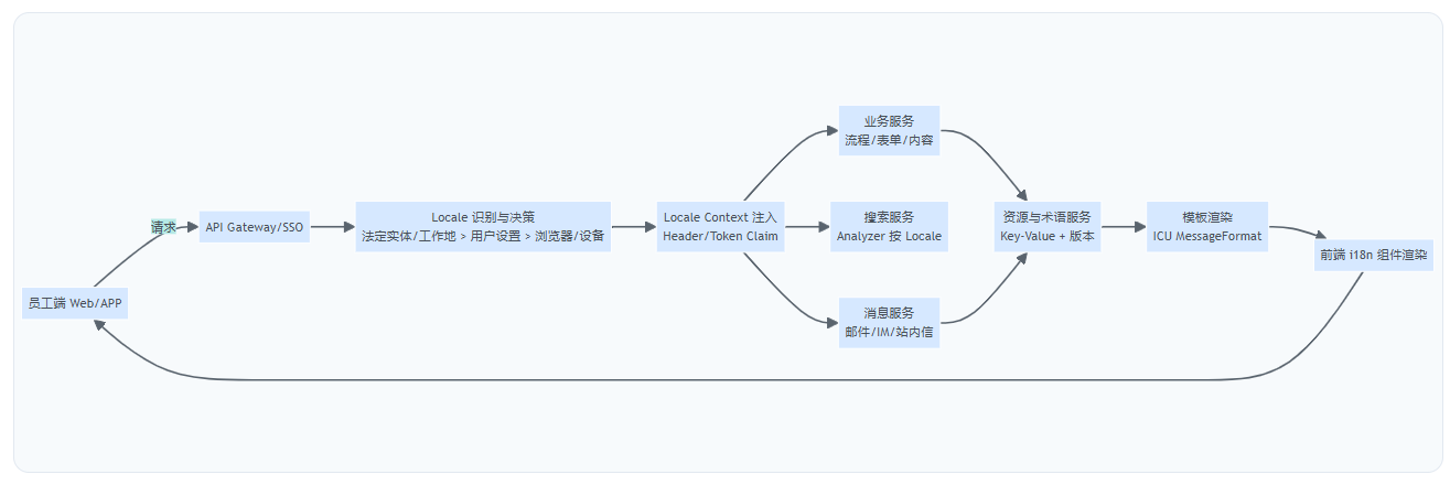 员工体验系统通常不是单体应用,而是门户 + 流程 + 内容 + 搜索 + 消息中心 + 多系统集成(HCM/薪酬/考勤/工单/协作工具)。多语言要稳定,必须做到一件事:Locale成为一级上下文,在网关、服务层、模板层、前端渲染层全链路一致传递。