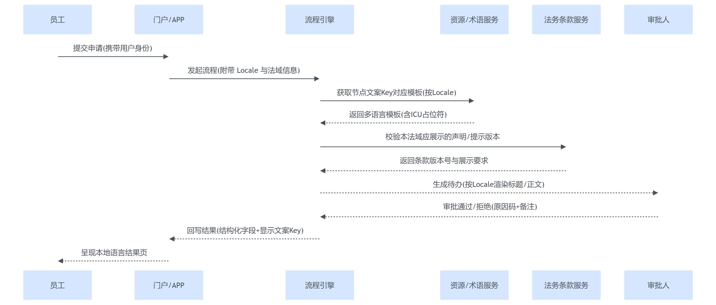 - 流程引擎运行时携带Locale,把节点名称、待办标题、通知内容全部以Key引用,在渲染层按Locale加载模板。